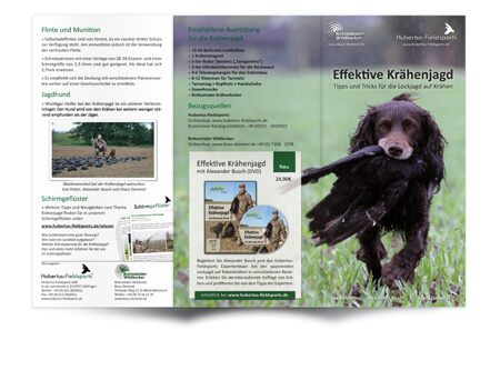 Wir haben eine kostenlose Infobroschüre "Effektive Krähenbejagung" herausgegeben. Sie enthält alle wichtigen Informationen zur effektiven Bejagung der Rabenkrähe. sowie Tipps zur richtigen Ausrüstung. Sie können diese bei uns herunterladen (auf das Bild klicken):
