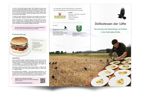 In Deutschland denkt man bei der Zubereitung von Wildgeflügel als erstes an Fasan, Taube oder Wildente. Dass aber auch Rabenkrähen eine Bereicherung der heimischen Wildküche sein können, ist vielen nicht bekannt. Die nachfolgenden Rezepte im Flyer "Delikatessen der Lüfte" zeigen die Vielfalt der Verwendung von Krähen in unserer modernen Küche (auf das Bild klicken):