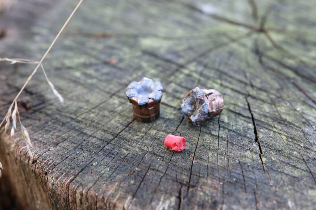 Beim ersten Einsatz der Laborierung fiel die Wirkung allerdings ebenfalls sehr bescheiden aus. Beim Bergen der Geschosse zeigte sich auch warum. Keines der Projektile hat bei Treffern von vorn in den Wildkörper aufgepilzt. Das Projektil von einem Knochentreffer zeigte sogar eine starke Einkerbung durch das Auftreffen auf das harte Material.