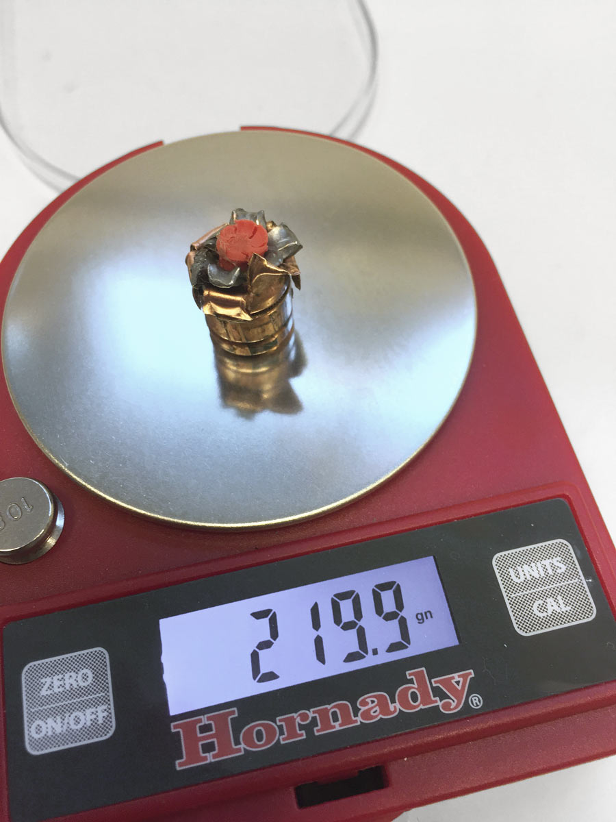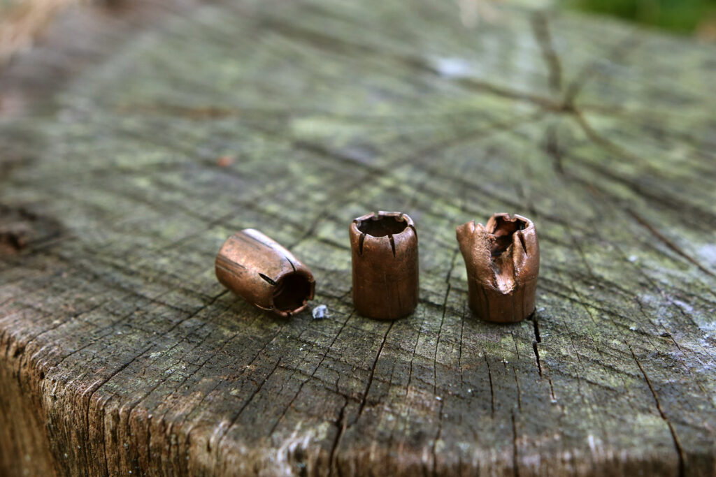Es musste also auf ein Geschoss gewechselt werden, das kontrollierter, verzögerter aufpilzt und dadurch mehr Tiefenwirkung erzeugt. Auf der Suche danach fiel das 165 grs./10,7 g Magtech SolidCopper Hollow Point auf. Das Geschoss besteht komplett aus Kupfer, wodurch sich nichts trennen kann.