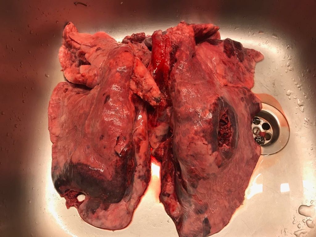 Das zweite Geschoss, das hinter dem Schulterknochen eingedrungen war, hat sogar den massigen Wildkörper komplett durchschlagen. Die Gewebezerstörung der beiden dabei durchdrungenen Lungenflügel ist für eine Kurzwaffe sehr beeindruckend.