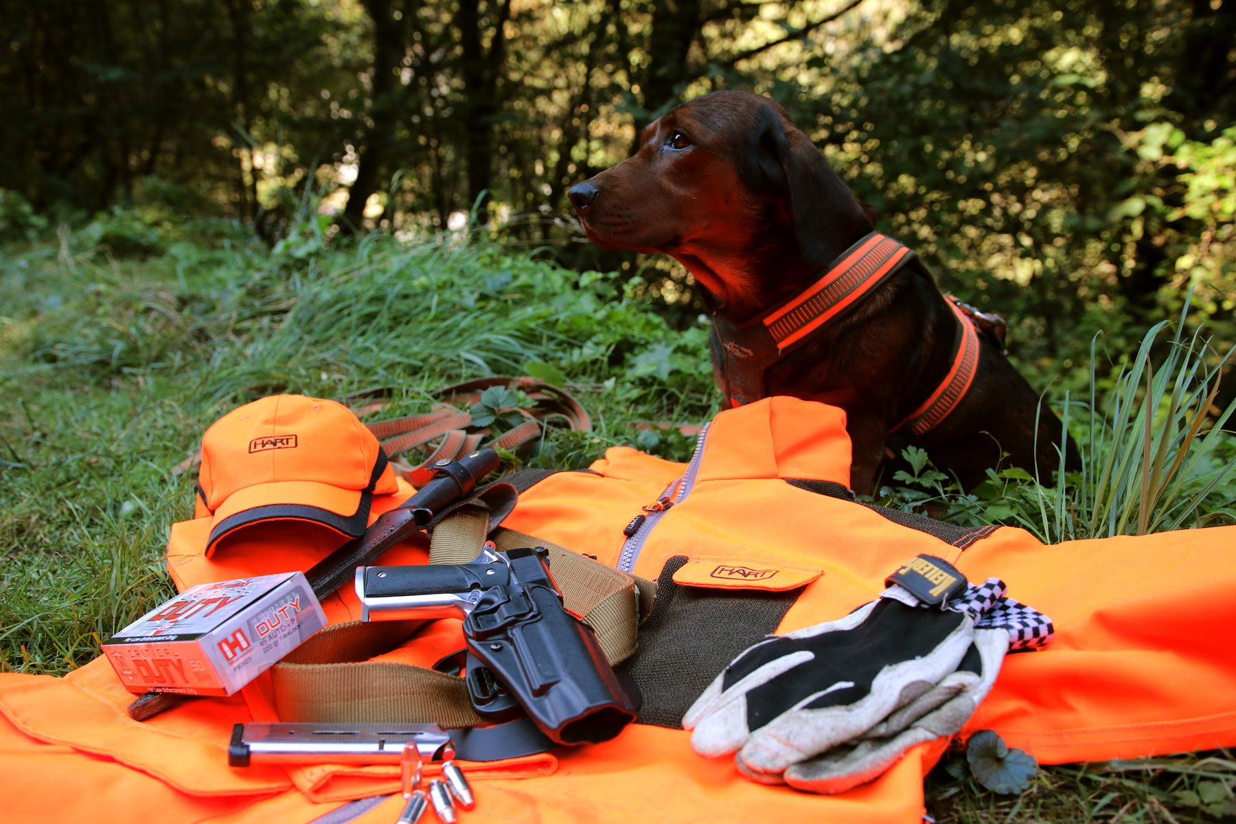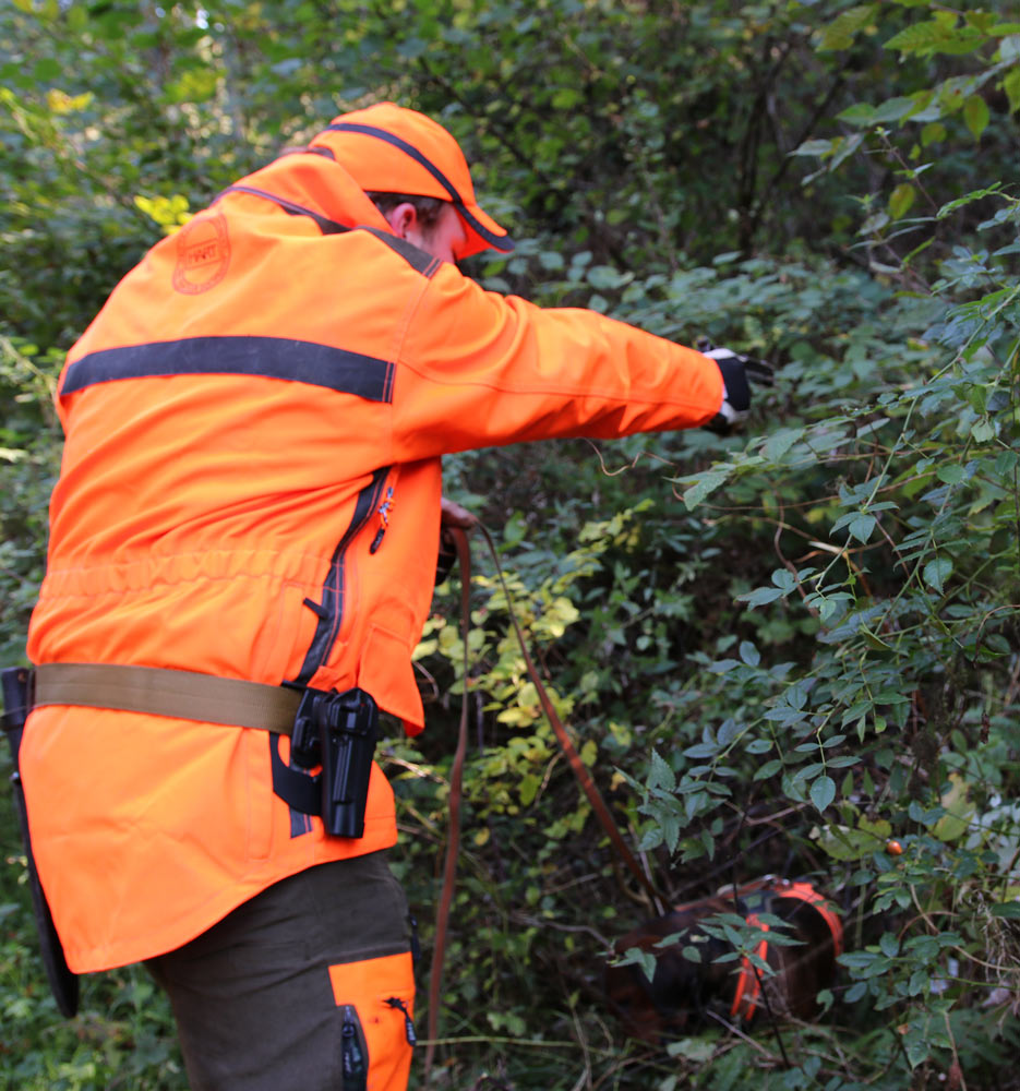 In diesem Artikel berichten wir von der theoretischen, technischen Seite in Verbindung mit den wertvollen Praxiserfahrungen des erfahrenen Hundeführers Maximilian Wiegand. Sein Griff zur Kurzwaffe als Mittel der Wahl bei bestimmtem Nachsuchen ist zwei wichtigen Faktoren geschuldet: zum einen besteht ein Großteil der Reviere, in denen er nachsucht aus steilen Hängen alter, verwilderter Weinberge mit dichtem Schwarzdorn, wo der Einsatz der Langwaffe teilweise nicht möglich ist, und zum anderen ist Maximilian genau wie sein Vater Max ein erfahrener, erfolgreicher IPSC-Kurzwaffenschütze, woher die sehr sichere Waffenhandhabung, inklusive etwaigem Ziehen aus dem Holster, auch in dynamischen Situationen herrührt.