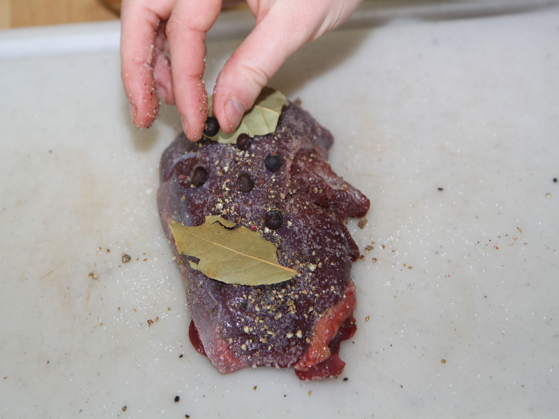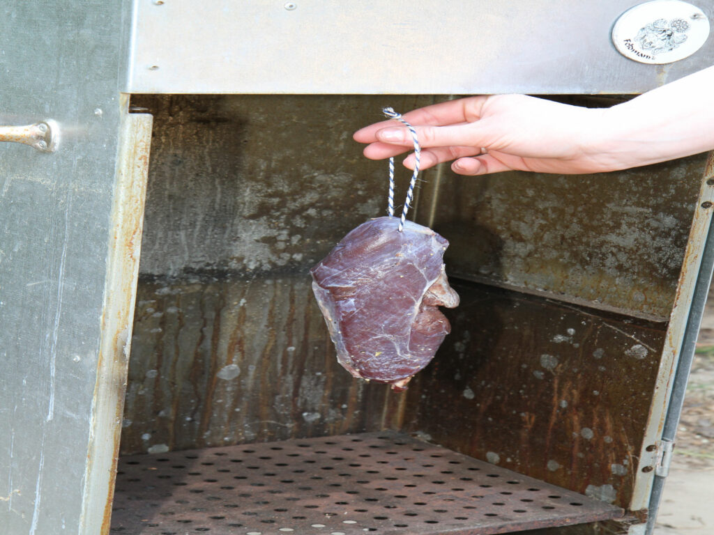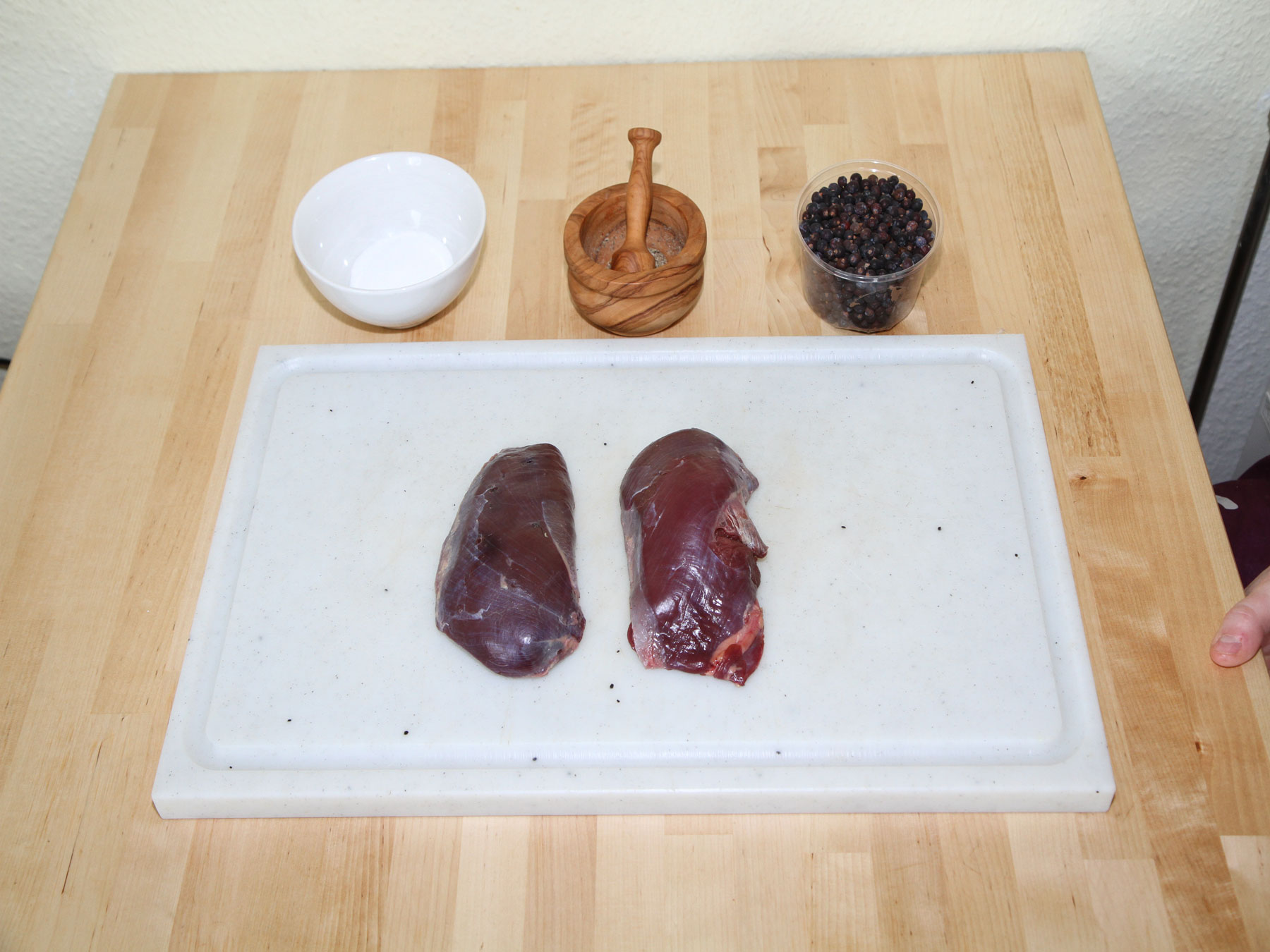 Die Gänsebrüste werden in ein Pökelgefäß gelegt und mit der Lake übergossen. Wichtig ist, dass die Brüste komplett von der Lake bedeckt sind. Danach das Gefäß in den Kühlschrank stellen und abdecken. Hygiene ist oberstes Gebot beim Arbeiten! Nach ca. 1 Woche die Lake abgießen, die Gänsebrüste mit kaltem Wasser abgießen und 5-6 Stunden trocknen lassen. Der Vorteil der Lakepökelung ist, dass das Fleisch etwas saftiger bleibt, da weniger Wasser entzogen wird.