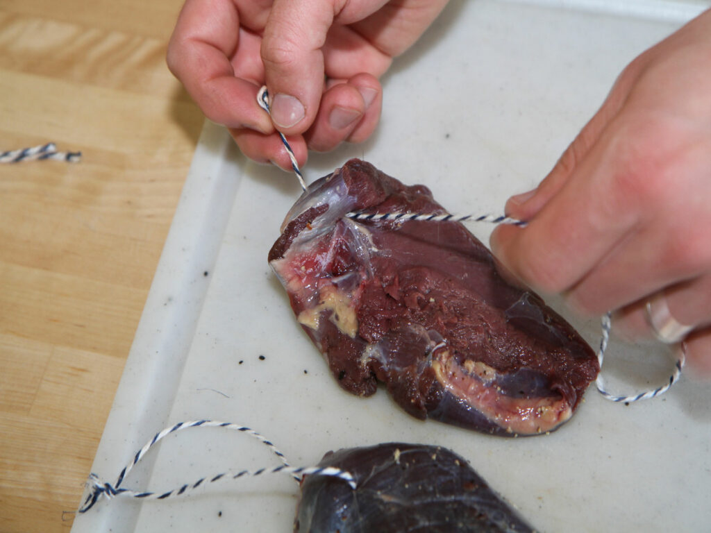 Pökeln und Zusammenbinden der Gänsebrüste zum Räuchern